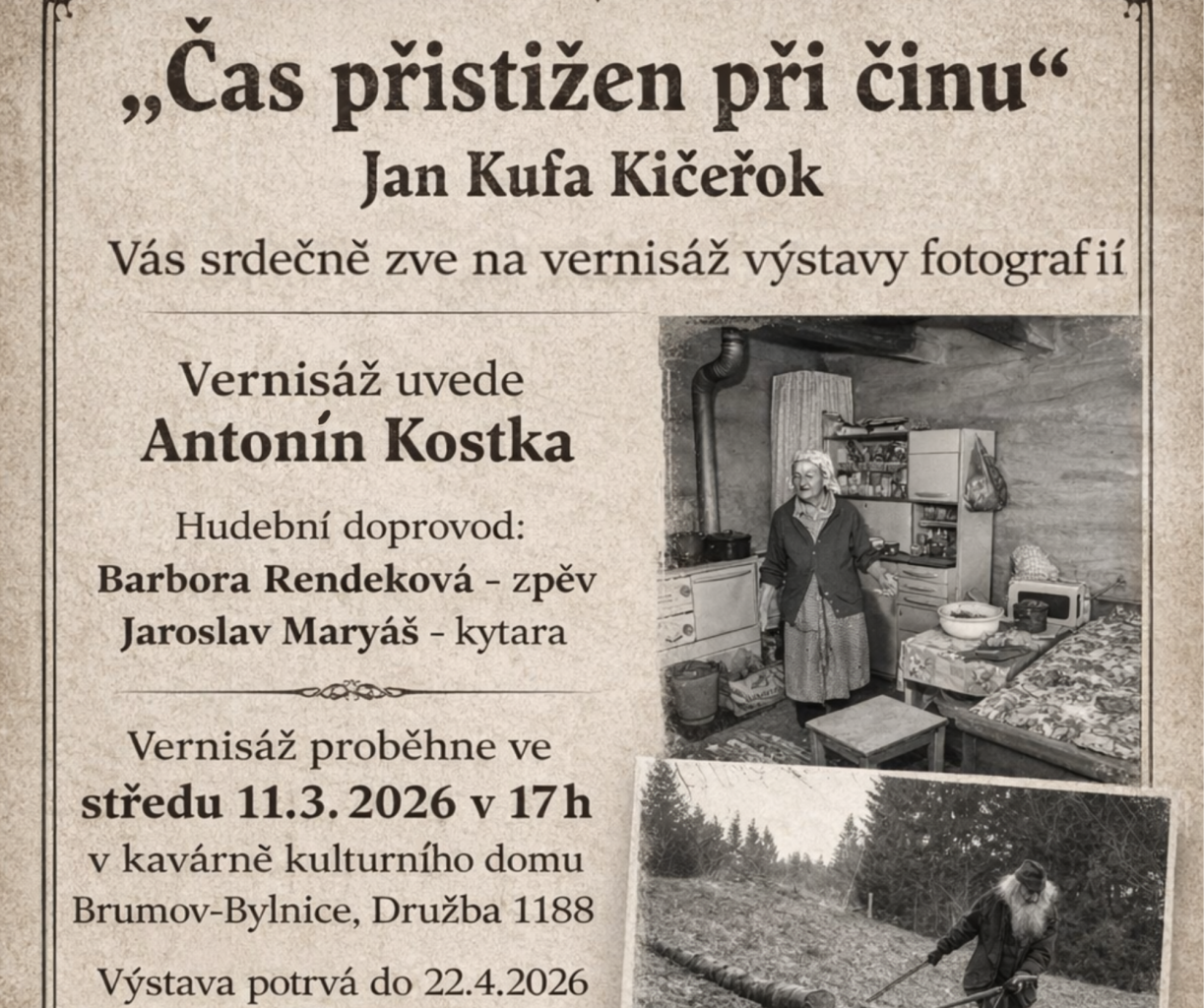 Vernisáž výstavy fotografií od autora ze severní Moravy - Jan Kufa Kičeřok, úvodním slovem provede Antonín Kostka a hudebně doprovodí Bára Rendeková - zpěv a Jarek Maryáš - kytara. Výstava potrvá do 22.4.2026