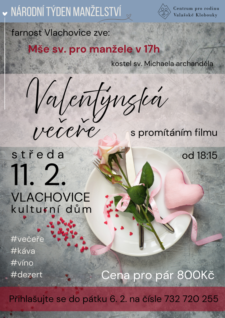 Zveme Vás na Valentýnskou večeři s promítáním filmu 11. 2. 2026 od 18:15 v KD Vlachovice.