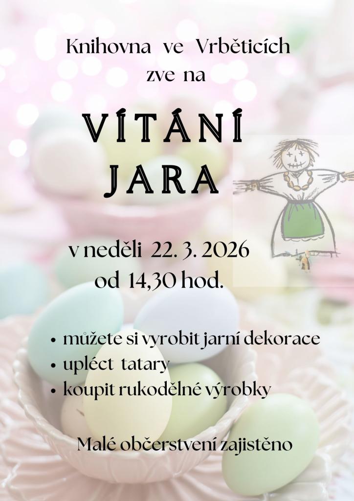 Knihovna ve Vrběticích vás srdečně zve na akci Vítání jara, která se koná v neděli 22. března 2026 od 14:30 hodin. Přijďte si užít odpoledne plné tvoření a příjemné atmosféry, kde si můžete vyrobit jarní dekorace nebo upléct tatar. Nezapomeňte také na možnost zakoupit rukodělné výrobky. Pro všechny návštěvníky bude připraveno malé občerstvení.