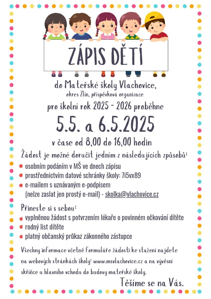 Mateřská škola Vlachovice pořádá zápis pro školní rok 2025 - 2026 ve dnech 5. a 6. května 2025 od 8:00 do 16:00.