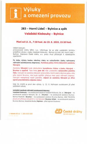 Dne 12. srpna proběhne na trati č. 283 - Horní Lideč - Bylnice a zpět výluka. Platí od 07:30 do 15:30 hodin.