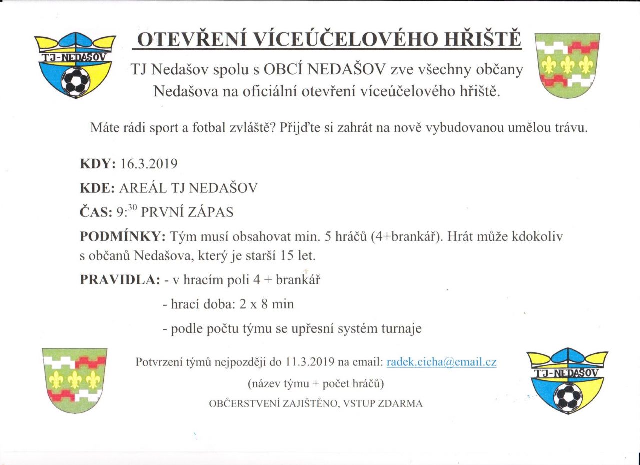 TJ Nedašov spolu s Obcí Nedašov zve všechny občany Nedašova na oficiální otevření víceúčelového hřiště.
