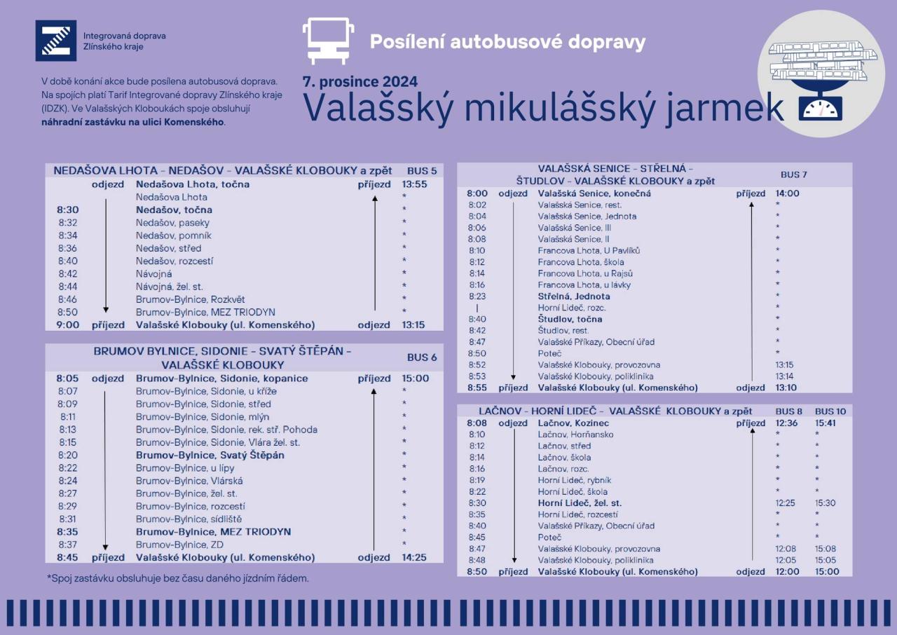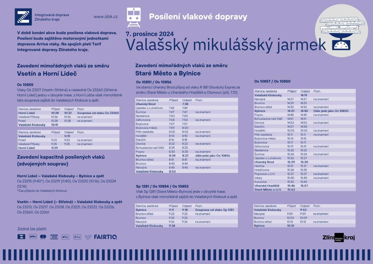 Při příležitosti Valašského mikulášského jarmeku ve Valašských Kloboukách v sobotu 7. prosince vás informujeme o posílení autobusových a vlakových spojů.