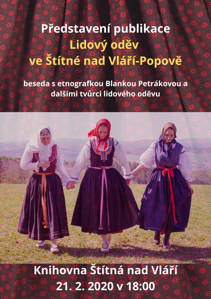 Dále zveme na akci týkající se folkloru. Kroj ve Štítné nad Vláří-Popově se nedochoval, ale místní to tak nenechali. Ve spolupráci s etnografkou Blankou Petrákovou, krojovou švadlenou Evou Kašparovou a dalšími odborníky kroj dle dostupných pramenů zrekonstruovali. Přijďte na besedu, která se koná 21. 2. v 18 hodin v Knihovně ve Štítné nad Vláří-Popově. Dozvíte se, jak rekonstrukce kroje probíhala, uvidíte ukázky krojových řemesel a seznámíte se s novou publikací.