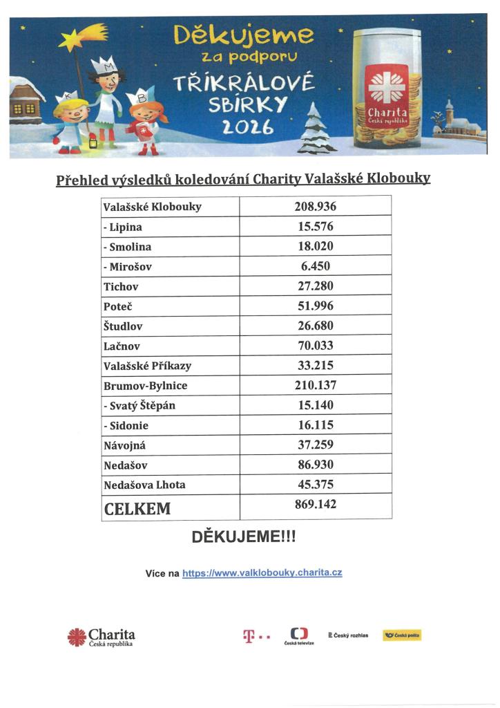 Přehled výsledků koledování Charity Valašské Klobouky - Tříkrálová sbírka Typ: PDF dokument, Velikost: 240.06 kB